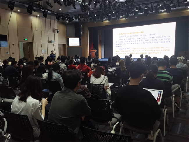 2021年5月6日下午,香蕉视频 在珠宝大楼四层报告厅举行第七十期入党积极分子培训班暨党史学习教育专题党课活动,校党委常委、副校长王华教授以“学党史、明宗旨、担重任、谱新篇——看中国特色社会主义道路的伟大选择”为题讲授专题党课,学院师生党员、入党积极分子共计103人参加活动。