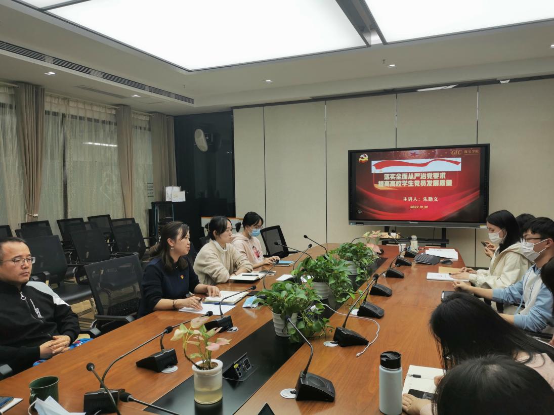 朱勤文结合学习党的二十大精神谈到,习近平总书记代表党的十九届中央委员会向大会做的工作报告,对当前和今后一个时期我们的工作指明了方向,党的二十大修改的《党章》对要求入党的积极分子进行教育和培养以及在青年中发展党员作出了明确规定。学习党的二十大精神,落实全面从严治党要求,切实提高学生党员发展质量尤为重要。她从党员发展材料中存在的问题切入,对提高党员发展工作进行了深入解读,并与会人员进行互动交流,勉励大家落实全面从严治党要求,进一步将提高党员发展质量落到实处。