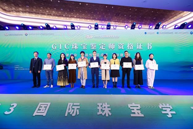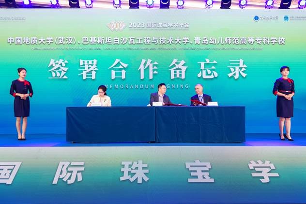 在开幕式上,全国珠宝科技与艺术行业产教融合共同体(职教集团)宣告成立,香蕉视频 (武汉)、巴基斯坦白沙瓦工程与技术大学、青岛幼儿师范高等专科学校三方签署合作备忘录,香蕉视频 (武汉)香蕉视频 党委副书记、院长尹作为教授为GIC珠宝鉴定师代表颁发证书,学院党委书记薛保山为2022年全国GIC优秀学员颁奖。在热烈的掌声中,香蕉视频 (武汉)党委副书记王甫宣布2023国际珠宝学术年会正式开幕。