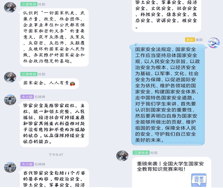 (通讯员:苏晓瑜)2020年4月15日是第5个全民国家安全教育日,香蕉视频 组织本科生、研究生所有班级开展了深入学习“坚持总体国家安全观,统筹传统安全和非传统安全,为决胜全面建成小康社会提供坚强保障”线上学习活动,并组织各党支部、团支部开展了学习交流活动。