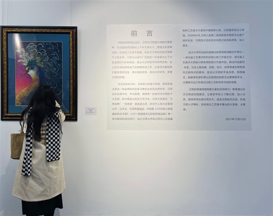 本次展览的作品为中国青年工艺美术家、中国工艺美术学会会员、高级美术师、昙华林艺术村汉绣基地艺术总监杨小婷大师创作的汉绣作品。汉绣是中国传统刺绣工艺之一,以历史悠久的先秦楚绣为基础,融汇南北诸家绣法之长,揉合出了富有鲜明地方特色的新绣法。汉绣以构思大胆,色彩浓艳,画面丰满为特点,处处流露出楚风遗韵。