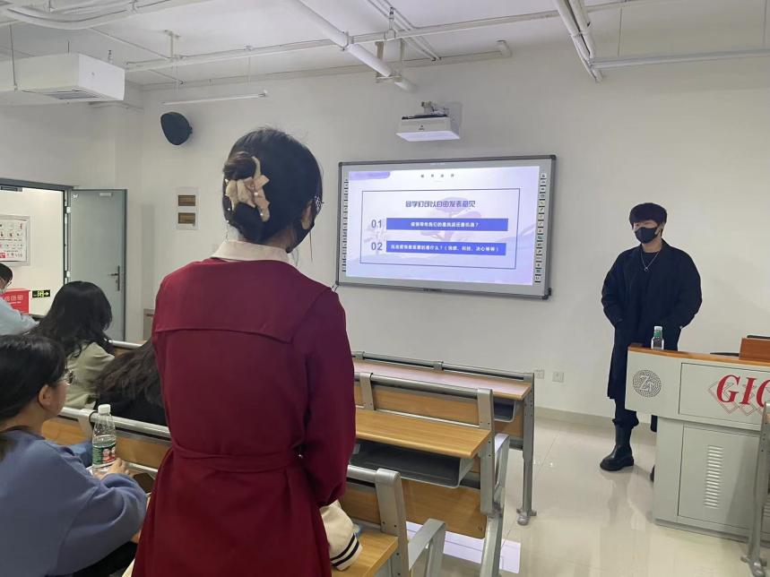 在“自由思辨”环节同学们针对“疫情带给我们的是挑战还是机遇?”和“抗击疫情最重要的是什么?”两个问题分享自己的看法和感想。141211班的心理委员韦嘉瑜同学表示,在疫情之下,有的同学常常受疫情困扰,生活和学习受到挑战。而有的同学能够利用疫情的形势将挑战转化为机遇,虽然出行不便,但他们顺势将更多时间投入到学习和工作中。这一点从学校图书馆常常爆满的情况就能发现。