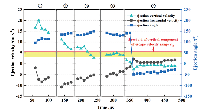 2)揭示了从基板“固基”出射的粉末飞溅的出射过程和气流速度阈值(图2)。卷吸作用下典型飞溅颗粒的出射过程分为4个阶段,即粉末颗粒在基板上团聚长大、进入惰性卷吸气流、进入金属蒸气羽流、落回粉床或进入惰性吹扫气流。