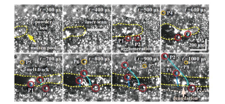 图3 金属蒸气直接作用于粉末颗粒,通过蒸气抬升力(t=100~300 μs)使粉末颗粒进入蒸气羽流,或通过蒸气反冲力(t=350~450 μs)使其落回粉床