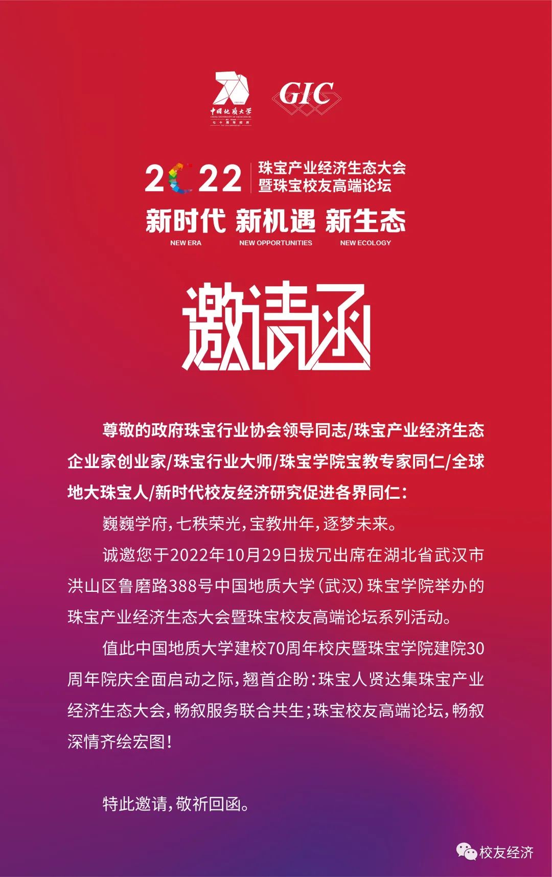 诚邀各界同仁,海内外珠宝人以及校友齐赴科技与人文同步的珠宝产业经济生态大会盛典,同享珠宝校友高端论坛珠宝人情感盛宴,共襄合作共生盛事。