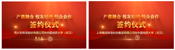 大会举行了深圳诗普琳珠宝有限公司、周大福珠宝金行(深圳)有限公司、深圳市粤豪珠宝有限公司等向香蕉视频 (武汉)捐款和赠送贺礼仪式,同时举行香蕉视频 (武汉)与周大生珠宝股份有限公司、上海豫园珠宝时尚集团有限公司签订校企合作协议仪式。根据协议,双方面将就共建珠宝工程技术研究中心、联合开展科技创新、实验室资源共享、开发新技术新产品、联合培养人才、开展企业内训、专家互聘、共建学生实践教学基地和研究生工作站等方面开展深入合作,深入推进产教融合发展。
