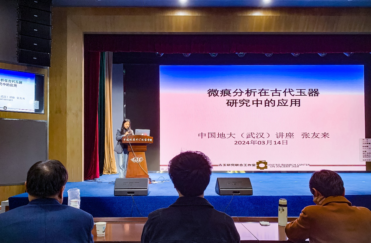 张友来以三星堆、牛河梁遗址、妇好墓、桐柏月河墓等出土的玉器为例,以高倍数照片对比以及视频测量演示让大家直观地看到玉器表面的微痕及测量数据,分析了中国古代制玉工艺。他以小南山的钻孔痕迹、战国水晶珠的表面抛光微痕、西周玉覆面玉片的“一面坡”工艺、随州叶家山出土柄型器阴刻线工艺等,图文并茂地向与会师生们介绍了微痕观察分析的方法,以及古人超高的玉器制作技术。