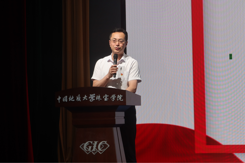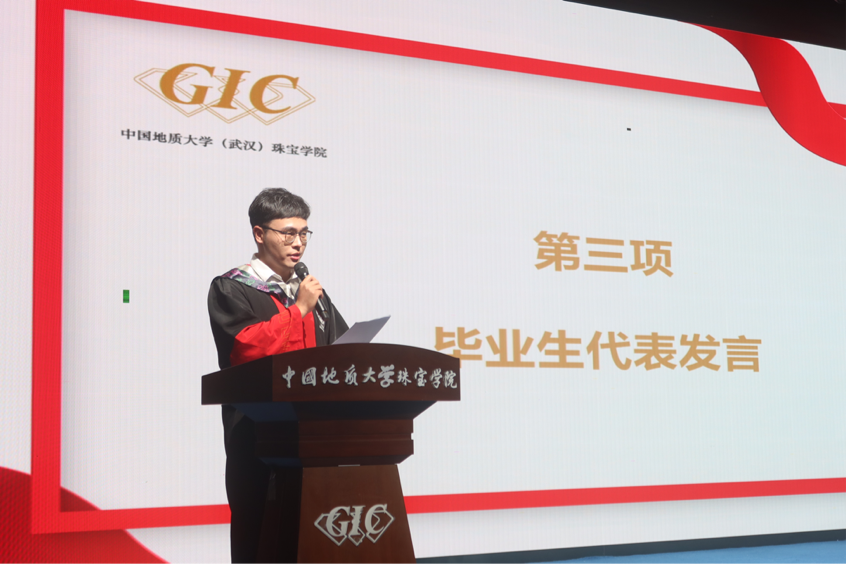 院长尹作为首先向2024年全体毕业生表示了热烈的祝贺。他讲到,各位毕业生今天所取得的成就经过了宝石般的沉淀打磨,最终也像宝石般闪耀。尹作为对即将进入人生下一阶段的同学们寄予了殷切期望,希望同学们在未来的道路上坚守自己的信仰和追求,发扬地大“勇攀高峰”的精神。深切期待各位同学能够始终铭记初心,服务社会,反哺母校,服务国家。尹院长叮嘱同学们要永葆赤诚之心,为社会进步与国家发展奉献自己的青春力量。最后,尹院长以“人生就像一颗宝石,需要经历磨砺和洗礼,才能够展示出最耀眼的光彩”作为结尾,诚挚祝愿各位同学在未来道路上能够像宝石一样熠熠生辉!