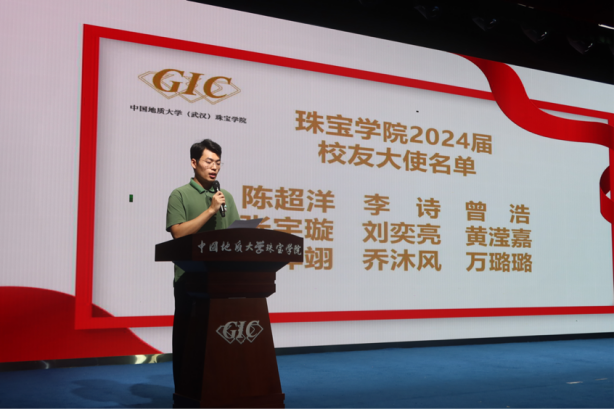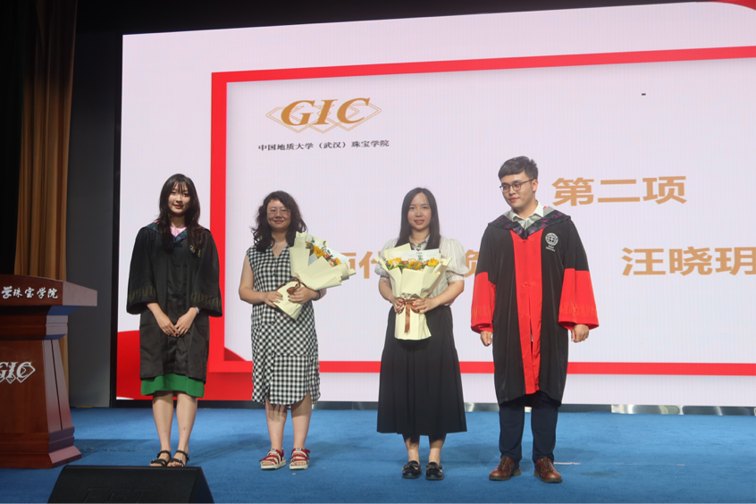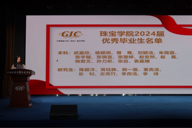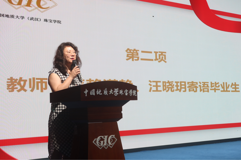 香蕉视频 为毕业生准备毕业纪念品,宝石系主任陈涛宣读优秀毕业生名单,宝石系教授殷杰为同学们颁发纪念品,毕业生代表上台领奖。
