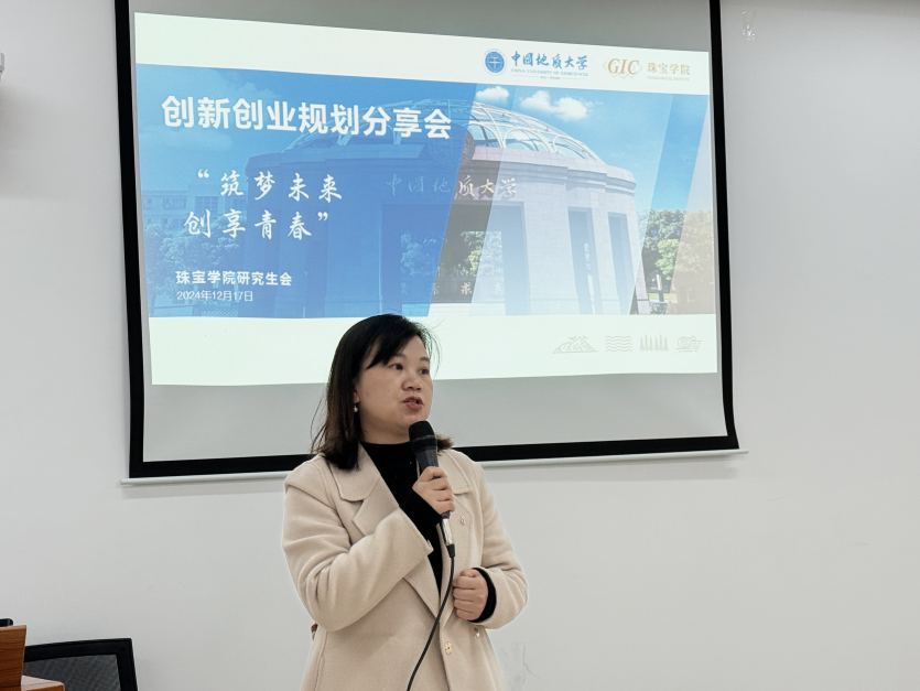 接下来由三位同学进行创新创业经验分享。2024年年度校园“创业之星”陈淑玲同学作为本期研言讲坛的主要分享人,分享了她的创业经历与经验收获。她详细介绍了学生群体创新创业想法的来源,并阐述了实现创业的关键步骤。陈淑玲同学强调,创业灵感往往源自日常学习,某些课程内容就能成为创业的启发。她结合本科玻璃艺术专业与研究生首饰设计专业的优势,成功创造了既艺术又实用的玻璃饰品,获得了广泛关注,实现了创业梦想。