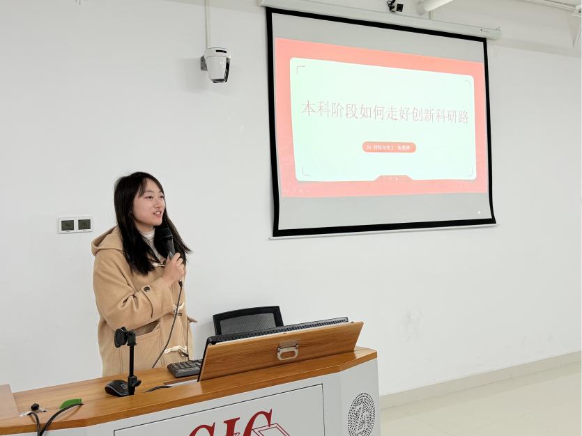 张楚婷同学在分享中回顾了自己的科研学习规划和创新经验,详细介绍了如何通过创新创业训练计划项目积累科研实践经验。她强调,科研学习规划应从早期开始,制定明确的目标,并逐步通过课题研究、文献阅读和实验设计等环节提升自己的科研能力。