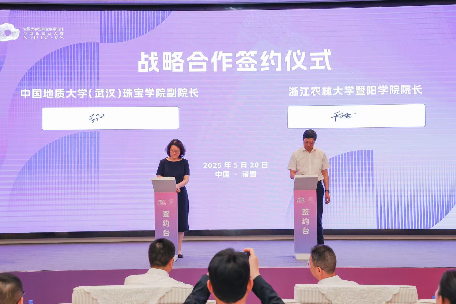 5月20日下午,副院长张荣红等应邀赴浙江诸暨出席2025山下湖·世界珍珠大会暨全国大学生珠宝创意设计与创新创业大赛启动仪式,会上张荣红作了《数智化时代艺科融合的思考》主题报告,并与浙江农林大学暨阳学院签署了战略合作协议。双方将在GIC职业教育、选派骨干教师担任对方客座教授、联合攻关珍珠优化技术、对接珍珠产业开展产学研一体化合作、联合参加国际珠宝展、向全球传播中国珍珠文化等开展全面合作。(通讯员 叶洪波)
