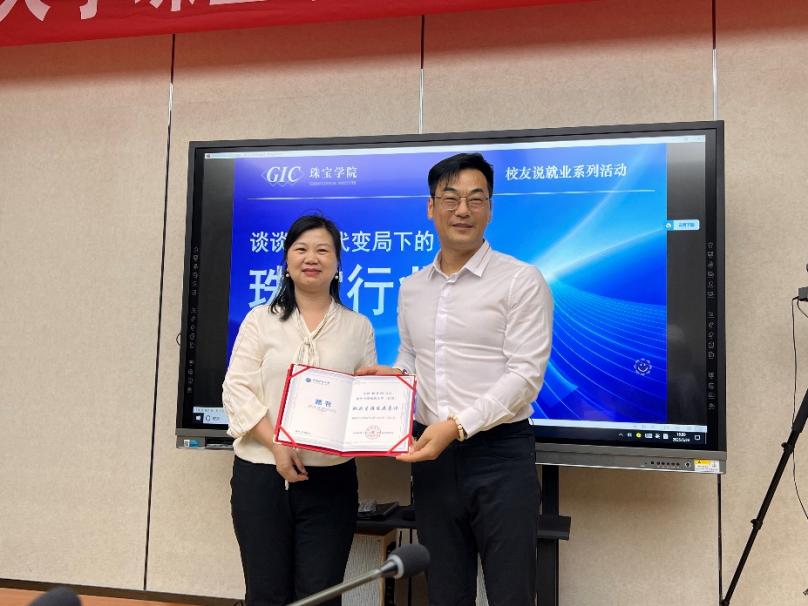 活动伊始,陈汉英向在座师生介绍封书阳学长的卓越成就。封书阳是爱一珠宝创始人、珠宝O2O定制模式创始人、“互联网+珠宝”的领军人物。陈汉英书记对其为珠宝行业发展所作出的贡献,以及对香蕉视频 人才培养所提供的大力支持表示诚挚感谢,代表香蕉视频 为封书阳学长颁发了职业生涯发展导师聘书。