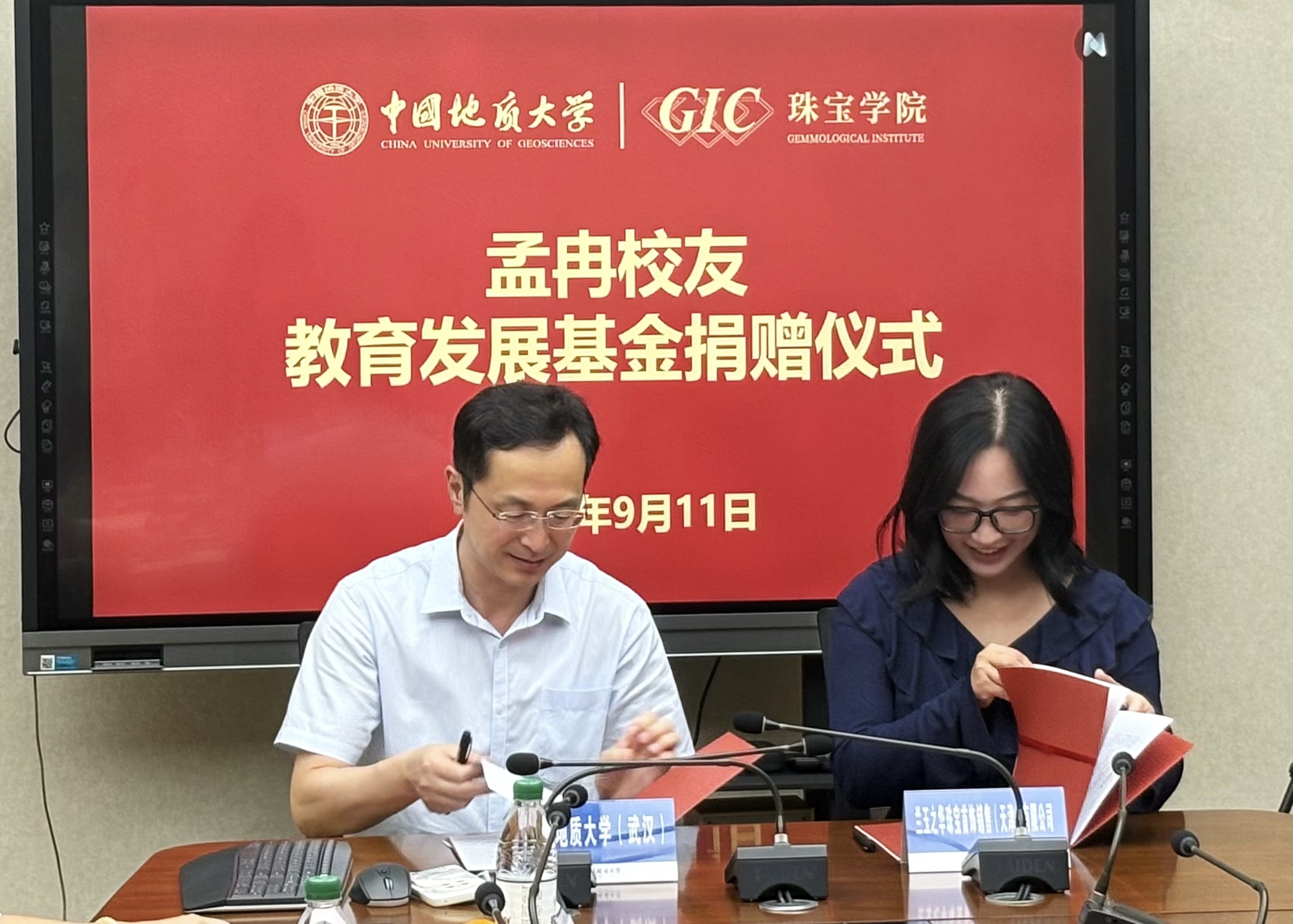 仪式伊始,情谊相连,活动在隆重而温馨的氛围中拉开帷幕。主持人陈汉英首先逐一介绍了出席本次仪式的双方参会人员,对孟冉校友重返母校表示最热烈的欢迎,并对长期以来关心支持学校发展的广大校友致以诚挚的感谢。