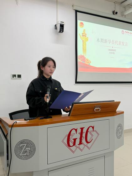第3期优秀学员代表李箐纾同学分享了在骨干培训班的宝贵经验。她提到,学生骨干要重视思想引领、创新前行与团队合作,其真诚的分享为新学员提供了清晰的成长参考。本期学员代表刘沛铭发言。她表示,要以归零心态求知、以律己准则守纪、以践履精神行动、以共享胸怀同行。承诺将践行青年担当,展现珠宝学子的青春风貌。