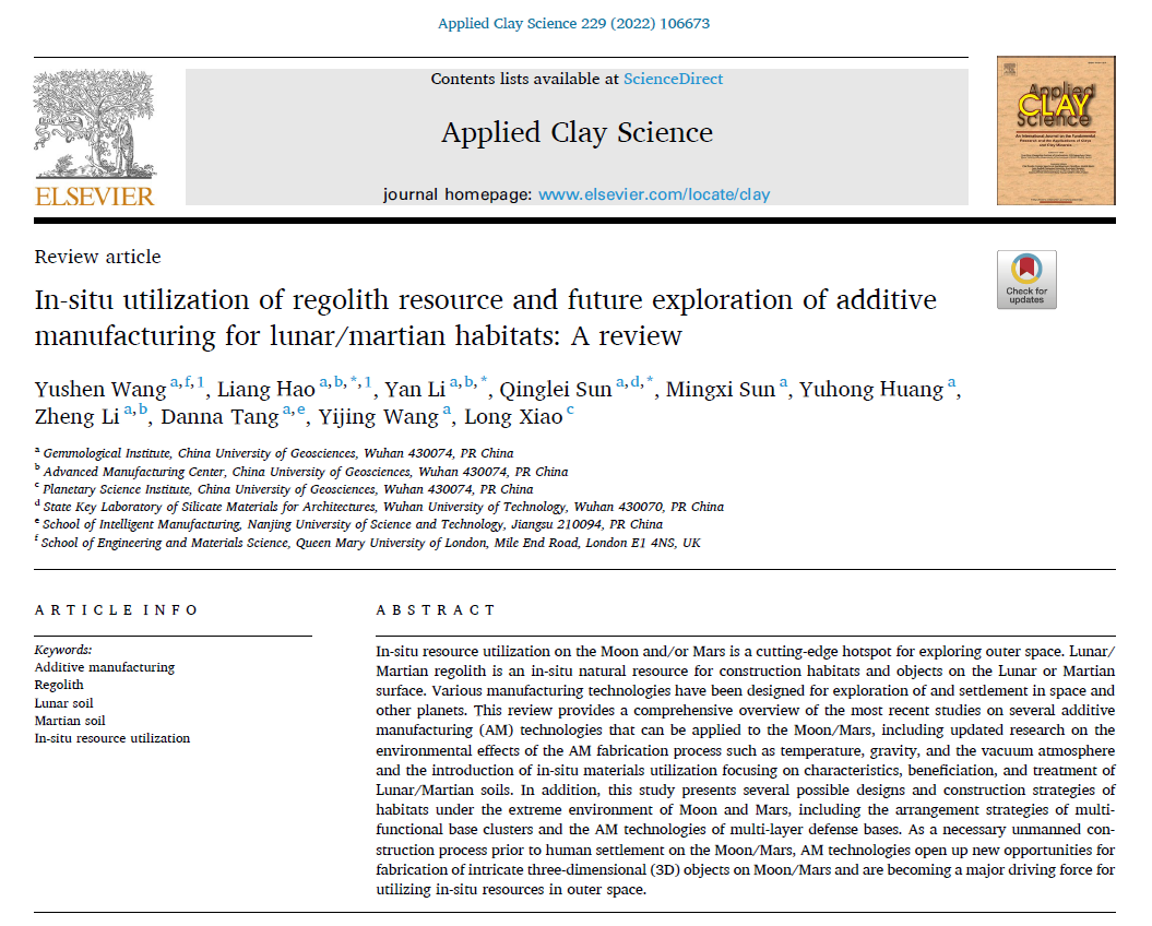 近日,香蕉视频 郝亮教授课题组发表了题为《风化层资源的就地利用和月球/火星栖息地增材制造的未来探索:综述》的论文。该研究成果被地球科学类重要期刊(《Applied Clay Science》,影响因子:5.907,T2,地球科学类中科院2区、工程技术类中科院2区)录用。论文第一作者为已毕业硕士研究生王雨珅和郝亮教授,共同通讯作者为郝亮教授、李妍副教授和孙庆磊副教授。香蕉视频 (武汉)行星科学研究所所长、载人航天工程空间科学与应用领域专家组成员肖龙教授为本论文的合作作者。
