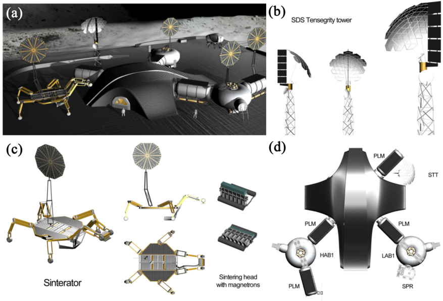 (b)太阳能动力系统塔,(c)微波烧结器概念,(d)基地布局