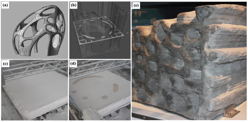 (c)机器人打印拱顶结构,(d)用硫磺混凝土浆料打印的拱顶结构模型