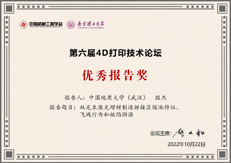 近日,香蕉视频 殷杰教授所作题为《双光束激光增材制造拼接区熔池特征、飞溅行为和缺陷溯源》报告获得第六届4D打印技术论坛“优秀报告奖”。