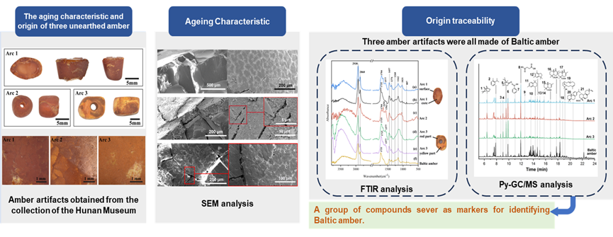 中国的琥珀艺术距今至少已有三四千年的历史,关系着古代中西方贸易往来及文化的交流融合,因而对出土琥珀文物进行产地溯源具有重要的历史文化意义。同时,为科学、持久地保存琥珀文物,最大限度地延缓琥珀文物在埋藏和保存过程中发生的劣化,亟需对出土琥珀的老化特征进行识别并厘清其老化降解机理。研究团队采用傅里叶变换红外光谱(FTIR)、扫描电子显微镜(SEM)和热裂解气相色谱质谱(Py-GC/MS)等对中国宋、明、清三个时期出土的多件琥珀制品进行了溯源及老化特征研究,探索了琥珀制品的自然老化机理。