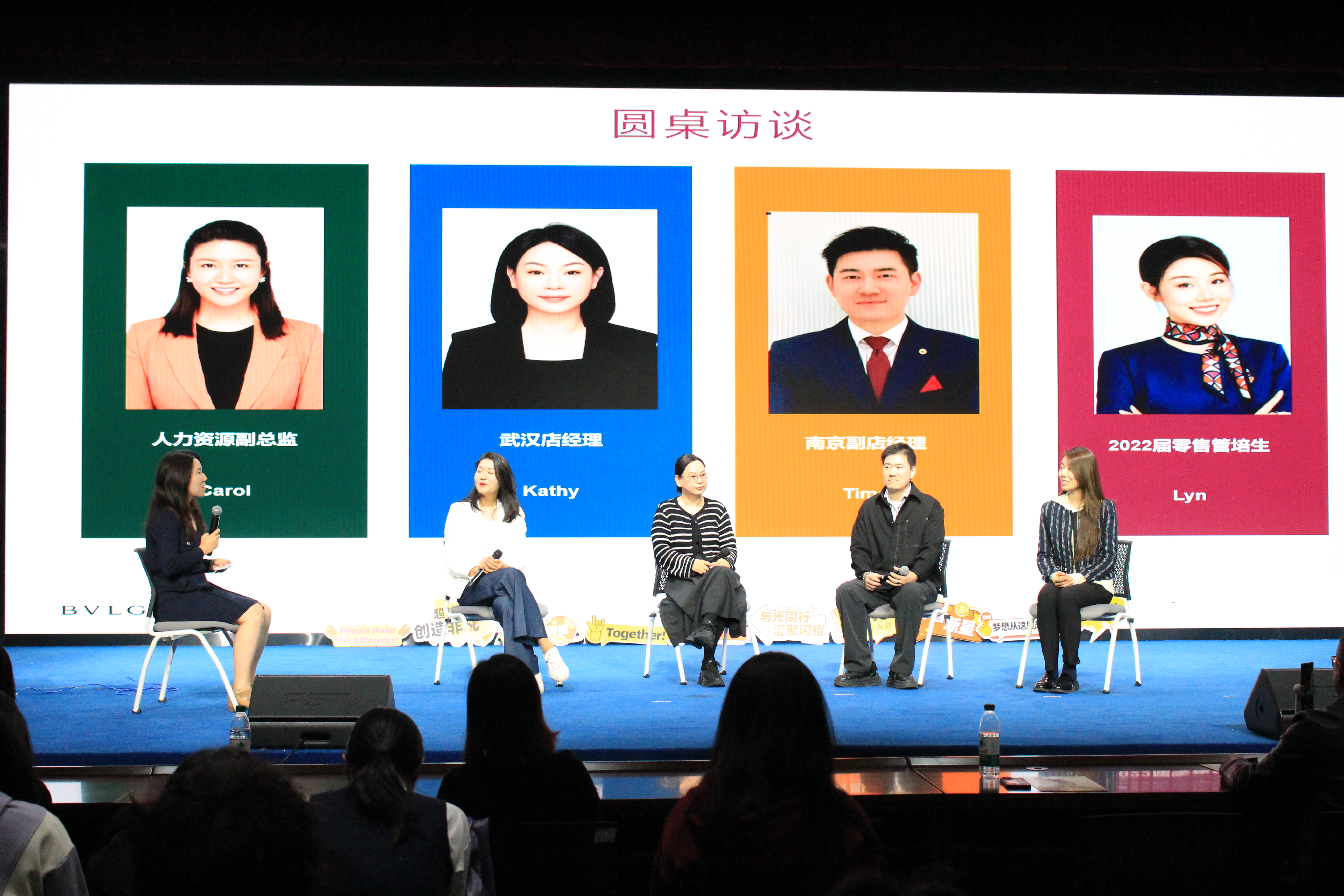 公司5位嘉宾于场上就坐,开展了一场别开生面的圆桌访谈。武汉恒隆及SKP店经理Kathy ZHANG分享了她在门店与同事们的相处经验,优秀员工代表—南京IFS店铺副经理及Top sales员工Timo WANG分享了自己跨专业转行做销售的心路历程。2022年零售管理培训生Lyn JIN作为香蕉视频 毕业生学姐分享了从一个珠宝设计的学生到宝格丽培训生的切身体验,生动展示了奢侈品行业的独特魅力与发展机遇,拉近了公司与毕业生之间的距离。