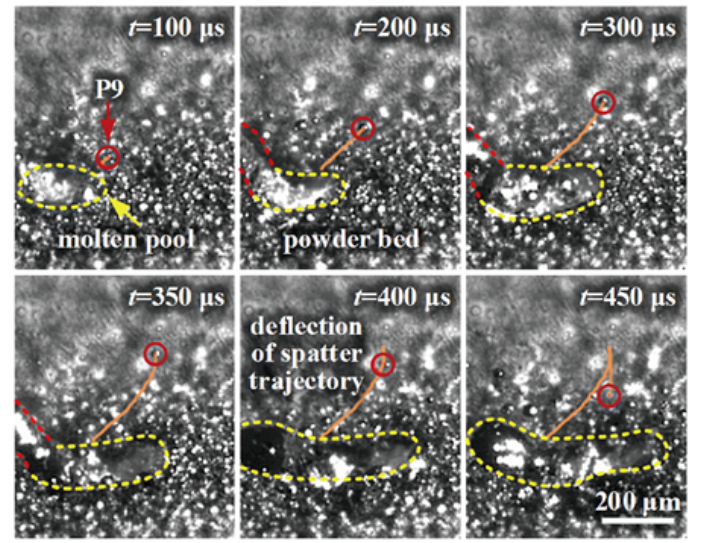 3)变害为利,将SLM成形中的飞溅作为示踪粒子,通过粉末颗粒与金属蒸气的“气-固”相互作用(如图3,飞溅颗粒上表面受激光辐照产生蒸气反冲力导致其运动轨迹发生偏转),原位测量飞溅瞬态动力学获得了金属蒸气反冲压,并且实验测量值与理论计算值符合得较好